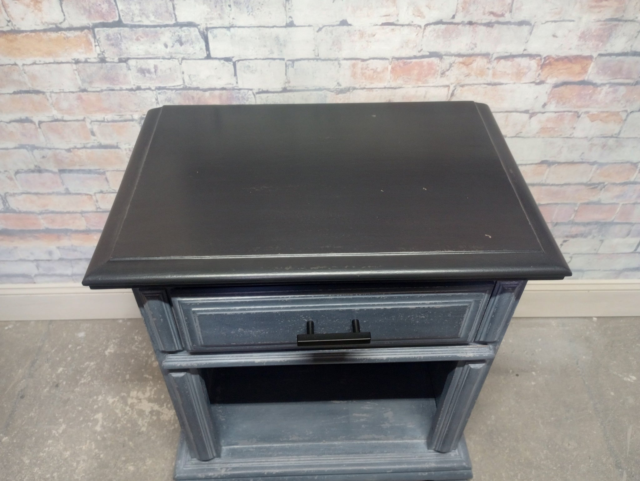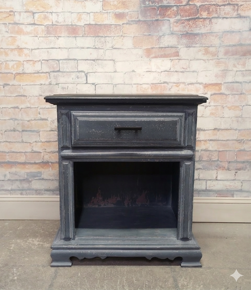 Vintage cottage style nightstand refreshed with a Weathered Gray Wash paint finish and a Classic Black top. Several layers of oil based paints and glazes give this hand scraped finish depth and texture. Sealed with a High Performance Topcoat. One smooth gliding , newly lined drawer. 24" x 16" x 27" high.