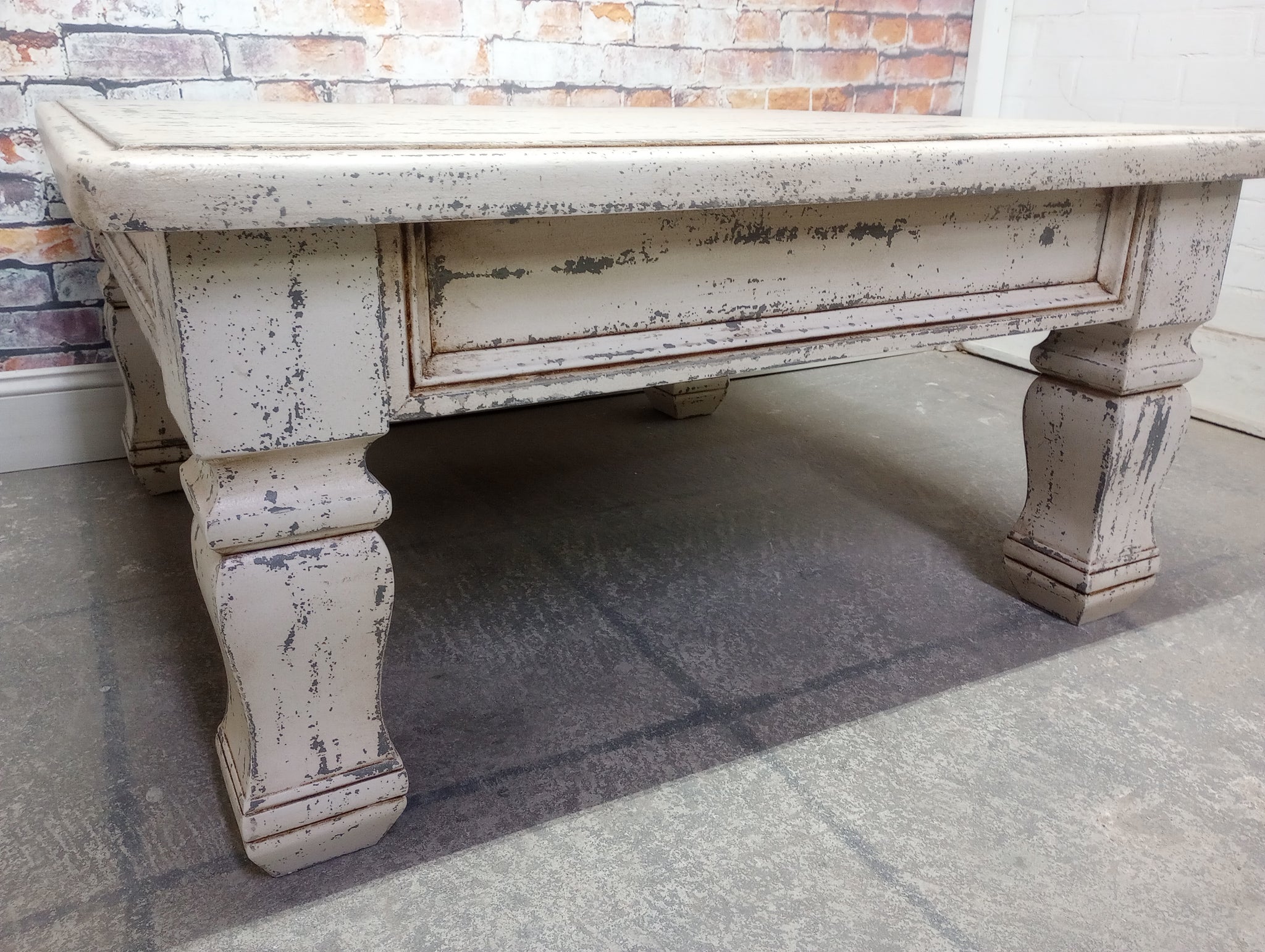 Vintage cottage style square coffee table refreshed with a Weathered Cottage Cream paint finish and a Tea Stain glaze. Several layers of oil based paints and glazes give this hand scraped finish depth and texture. Sealed with a High Performance Topcoat. 38 x 38" x 19" high.
