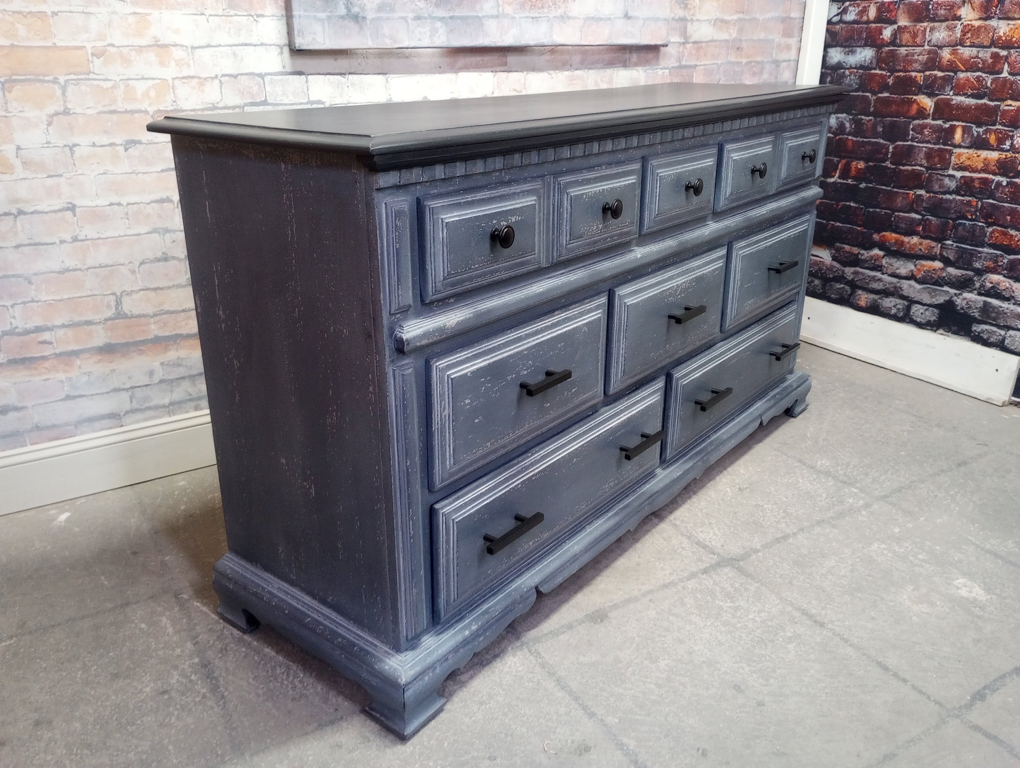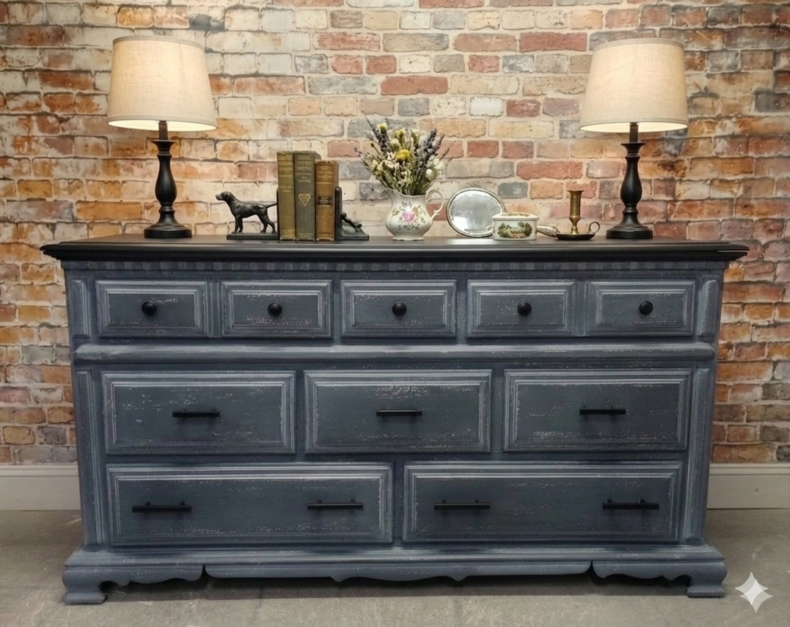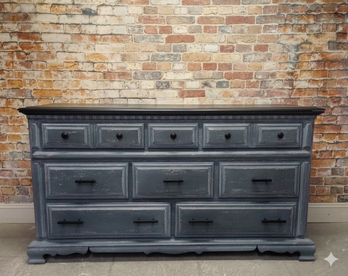 Vintage cottage style triple dresser refreshed with a Weathered Gray Wash paint finish and a Classic Black top. Several layers of oil based paints and glazes give this hand scraped finish depth and texture. Sealed with a High Performance Topcoat. Eight smooth gliding , newly lined drawers. 60" x 18" x 32 3/4" high.