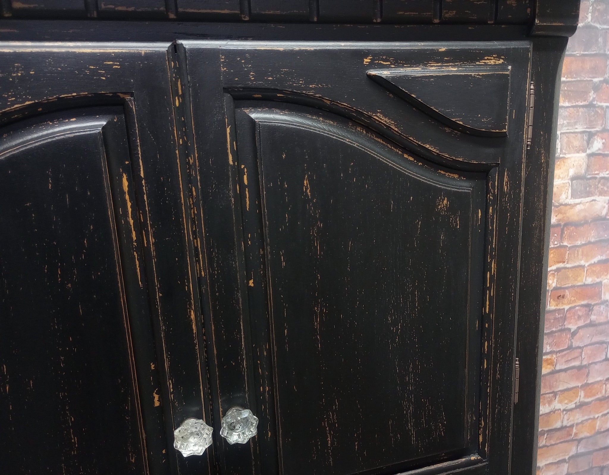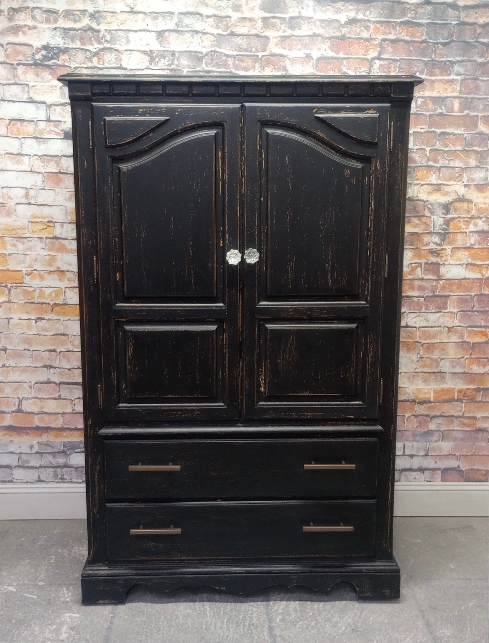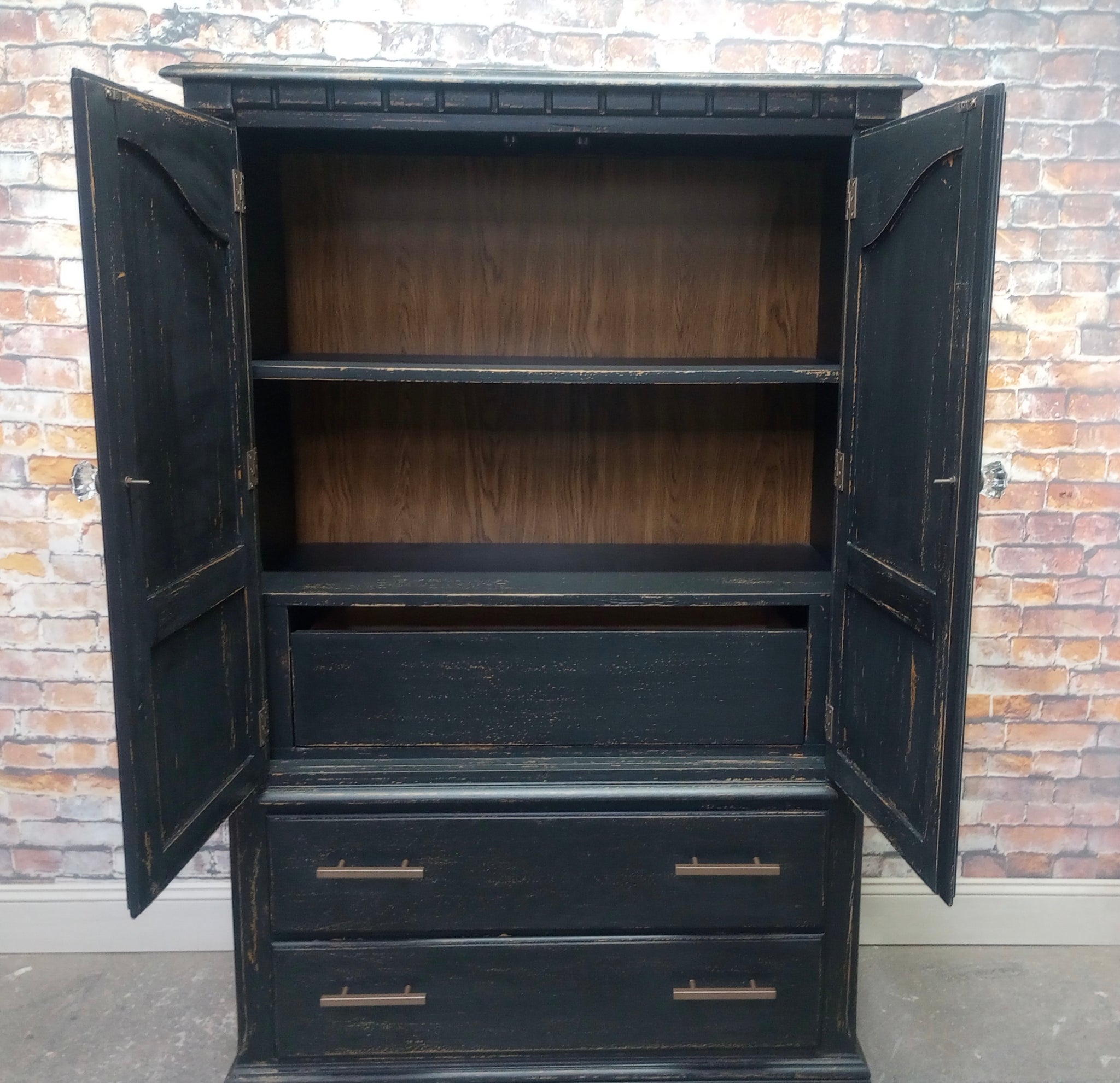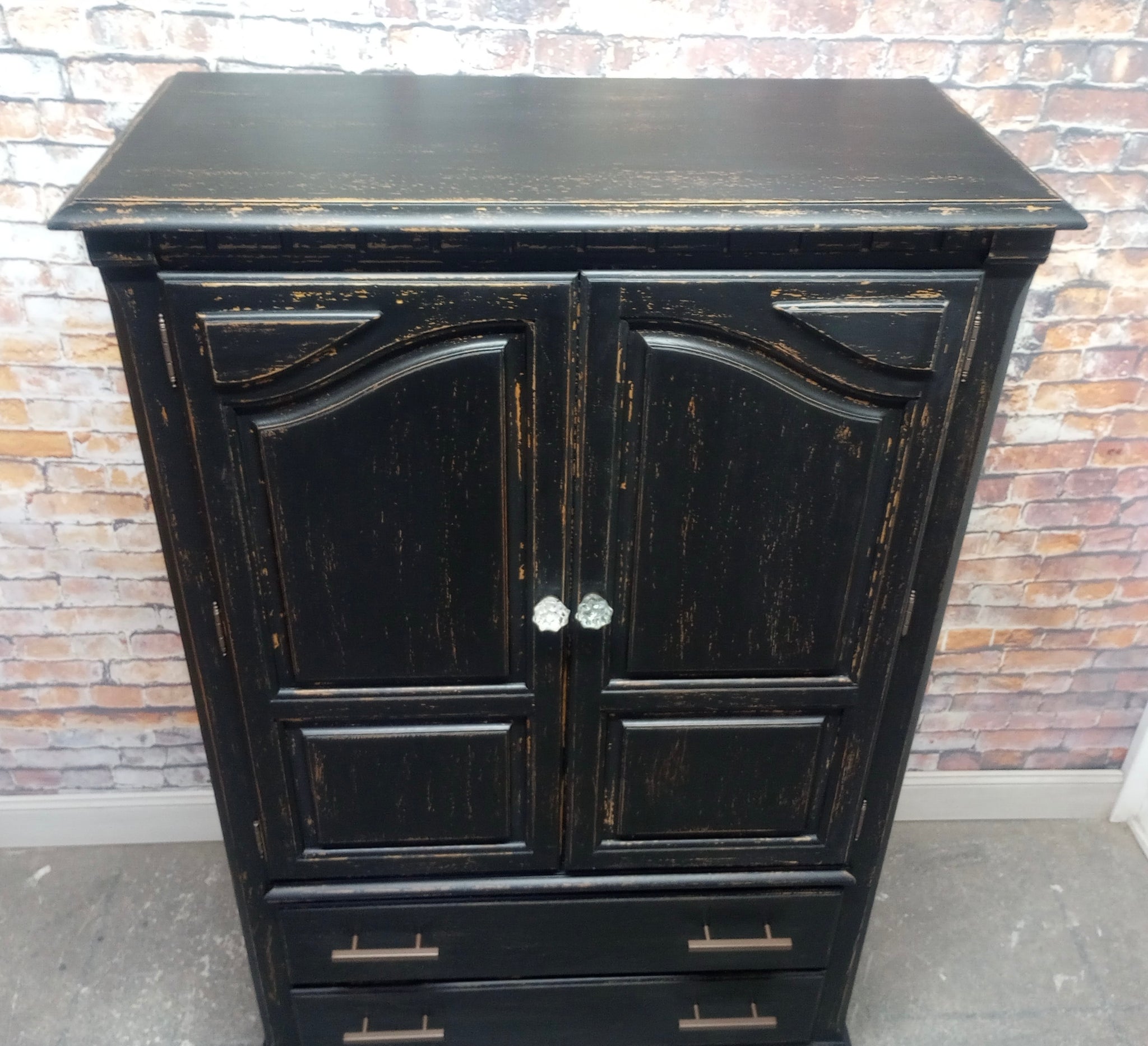 Vintage Thomasville armoire cabinet refreshed with a Weathered Black paint finish. Several layers of oil based paints and glazes give this hand scraped finish depth and texture. Sealed with a High Performance Matte finish. Three smooth gliding, newly lined drawers. Cabinet interior finished. 38" x 18" x 60 1/4" high.