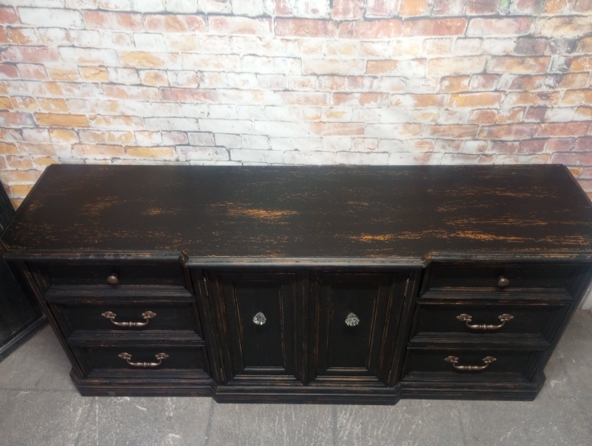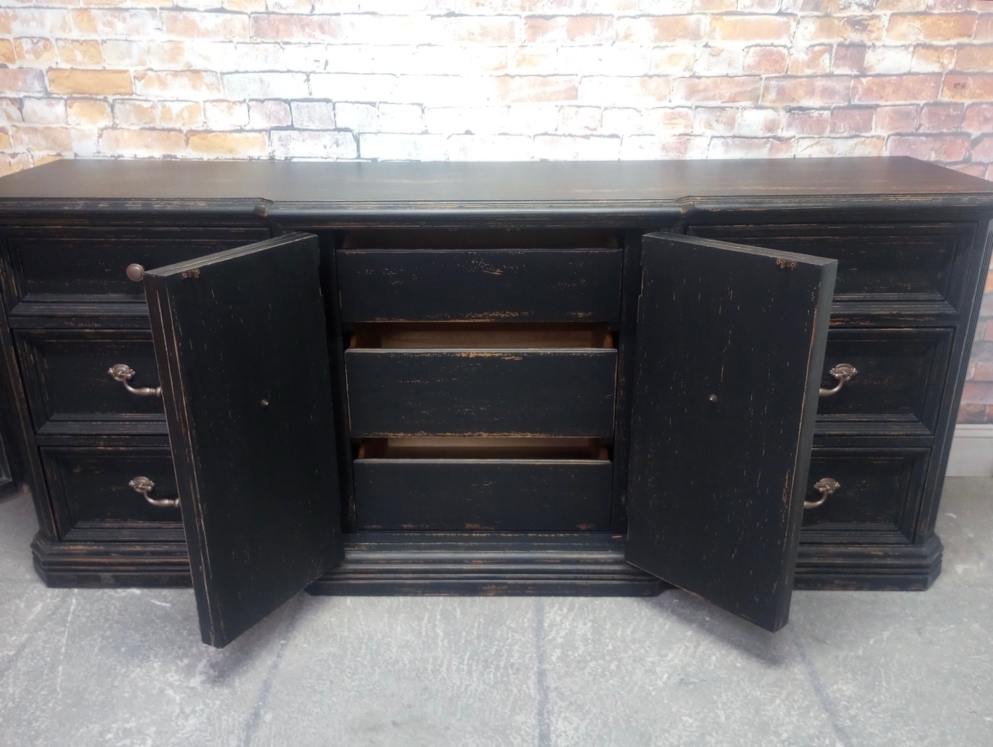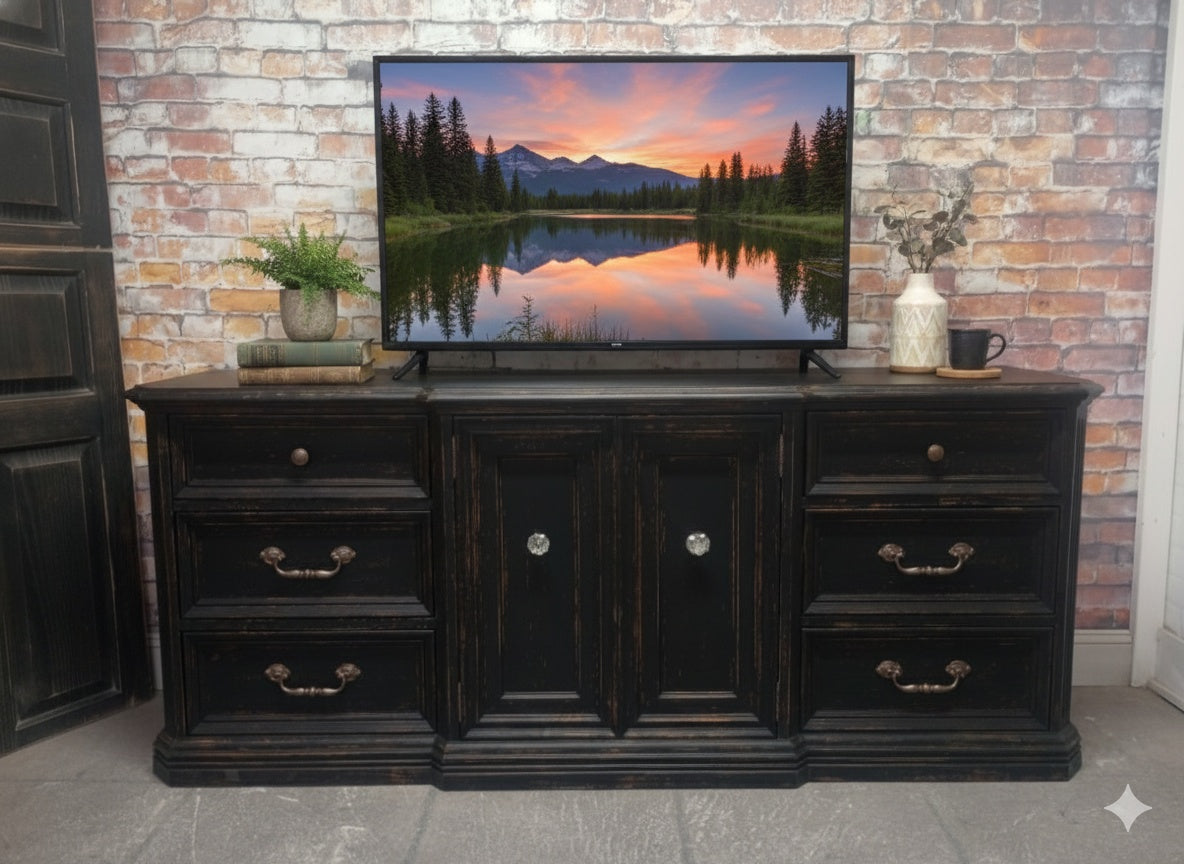 Vintage Skylar Peppler brand triple dresser refreshed with a Weathered Black paint finish. Several layers of oil based paints and glazes give this hand scraped finish depth and texture. Sealed with a High Performance Matte finish. Nine smooth gliding drawers. 72" x 19" x 30 1/4" high.