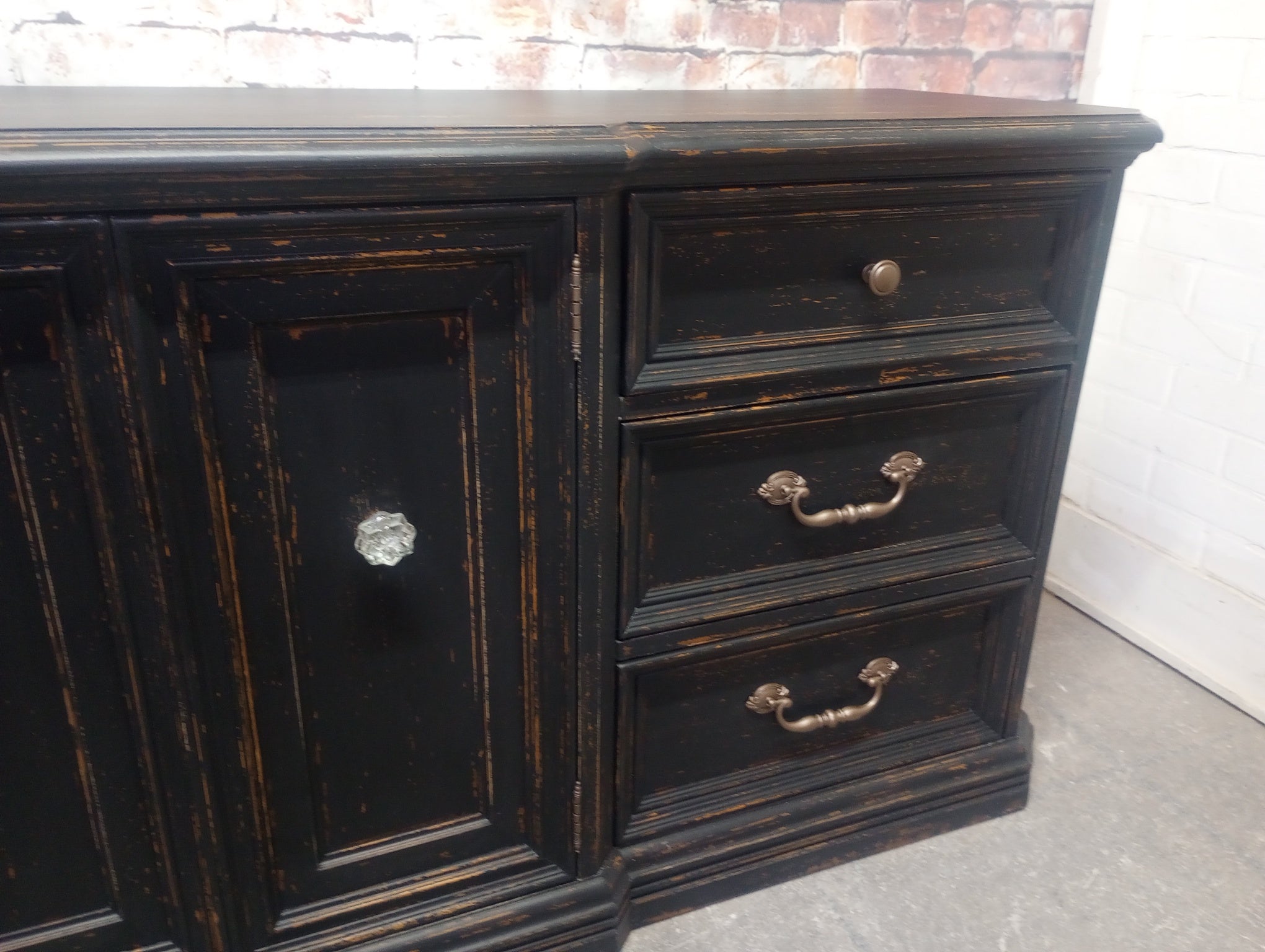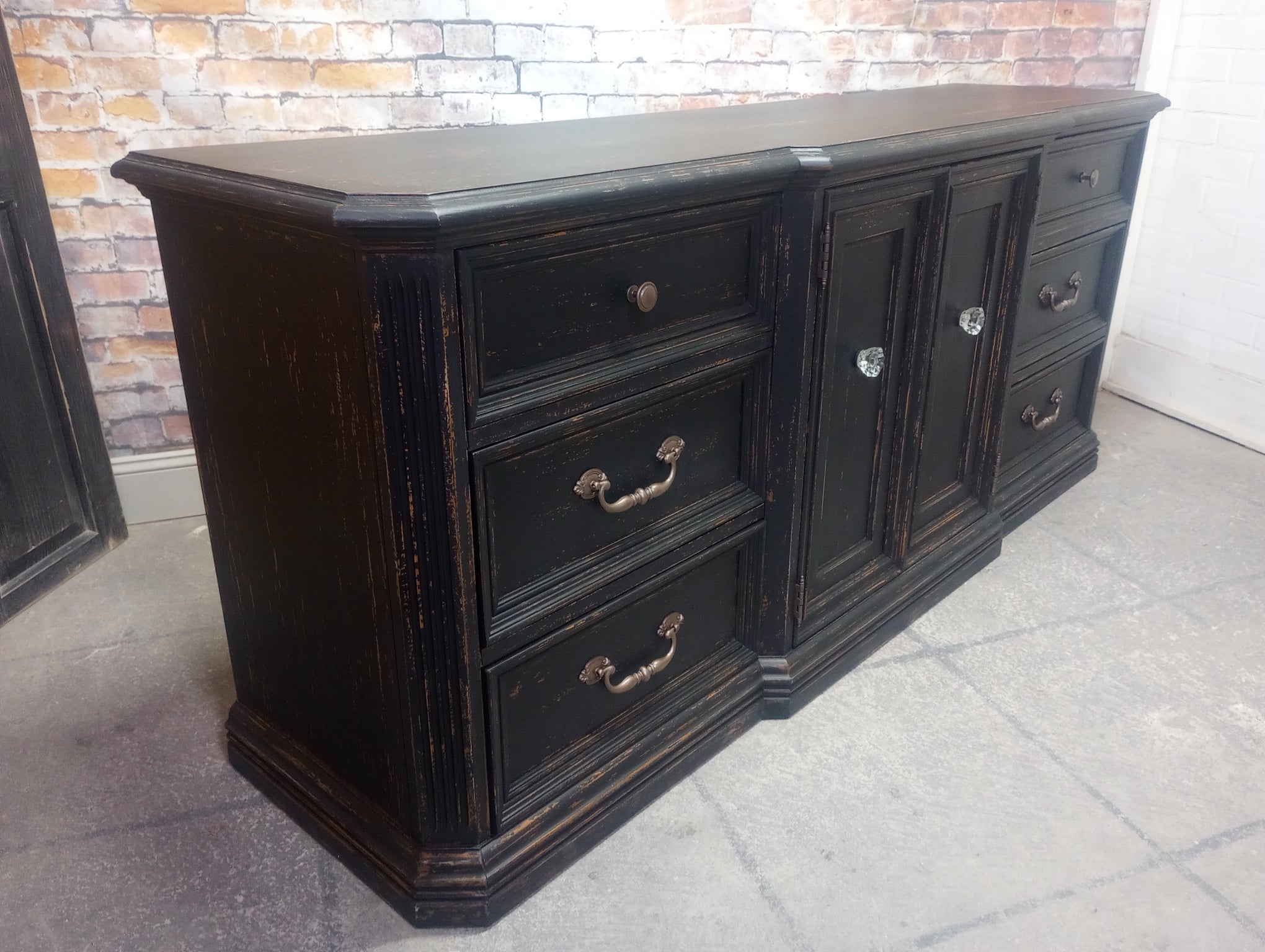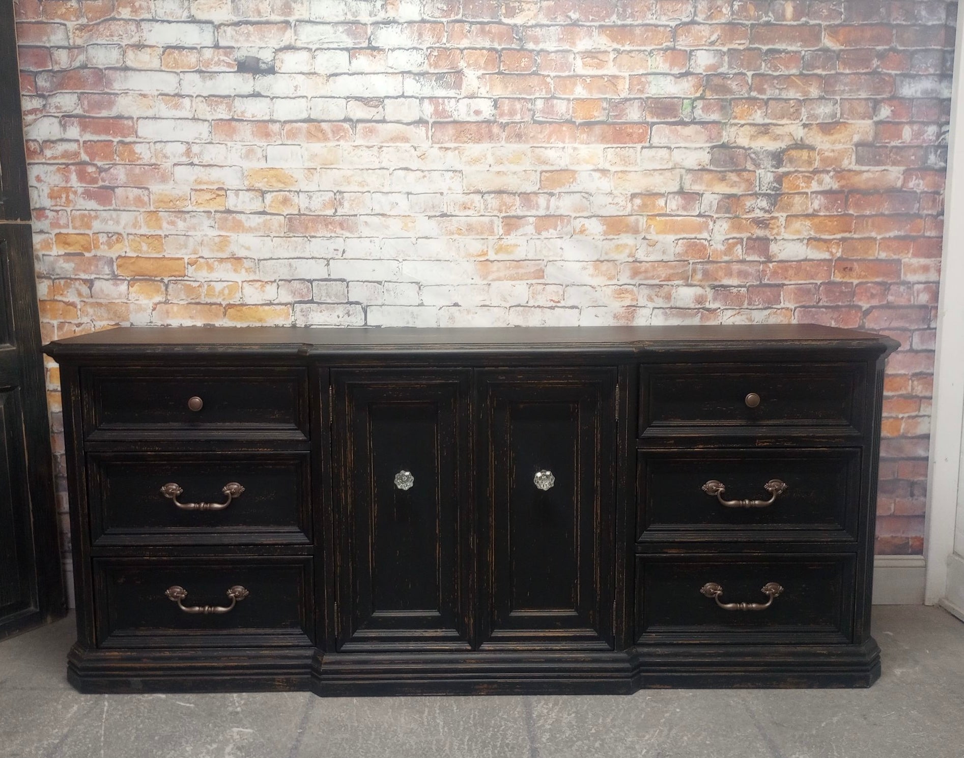 Vintage Skylar Peppler brand triple dresser refreshed with a Weathered Black paint finish. Several layers of oil based paints and glazes give this hand scraped finish depth and texture. Sealed with a High Performance Matte finish. Nine smooth gliding drawers. 72" x 19" x 30 1/4" high.